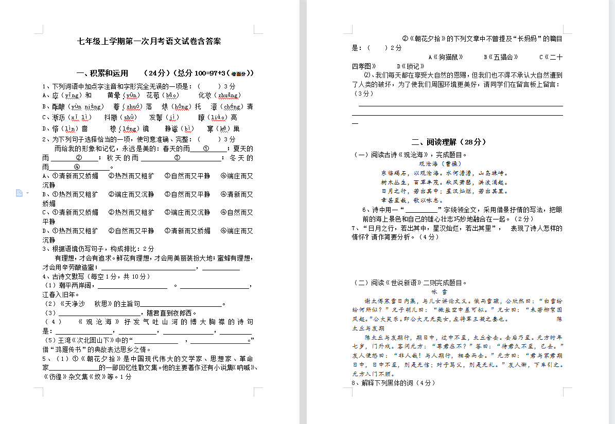 本文标题:七年级上学期第一次月考语文试卷含答案2951字