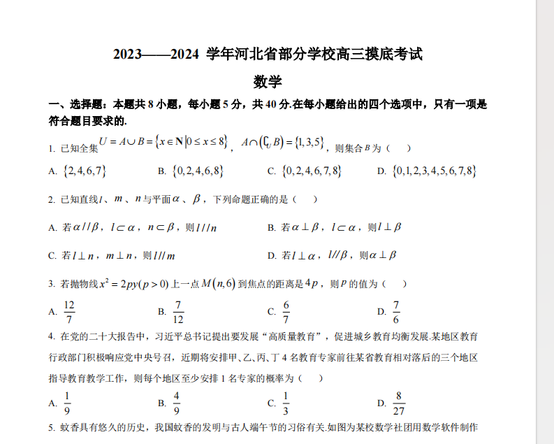 本文标题:河北省部分学校2024届高三上学期摸底考试数学试题.zip