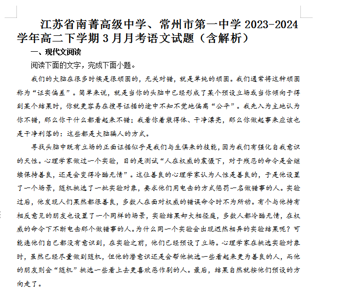 本文标题:江苏省南菁高级中学、常州市第一中学2023-2024学年高二下学期3月月考语文试题(含解析)