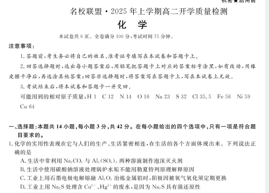 本文标题:湖南名校联盟2024-2025年高二下学期开学质检化学试题+答案.pdf