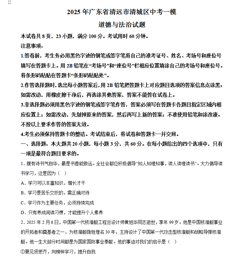 本文标题:_2025年广东省清远市清城区中考一模道德与法治试题