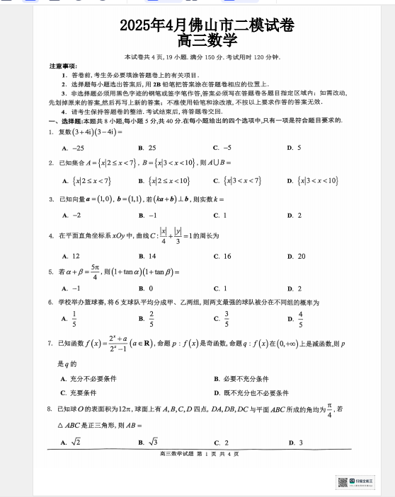 本文标题:4.16 2025年4月佛山市二模数学模拟试卷