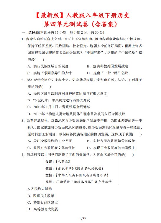 本文标题:人教版八年级下册历史第四单元测试卷(含答案).pdf