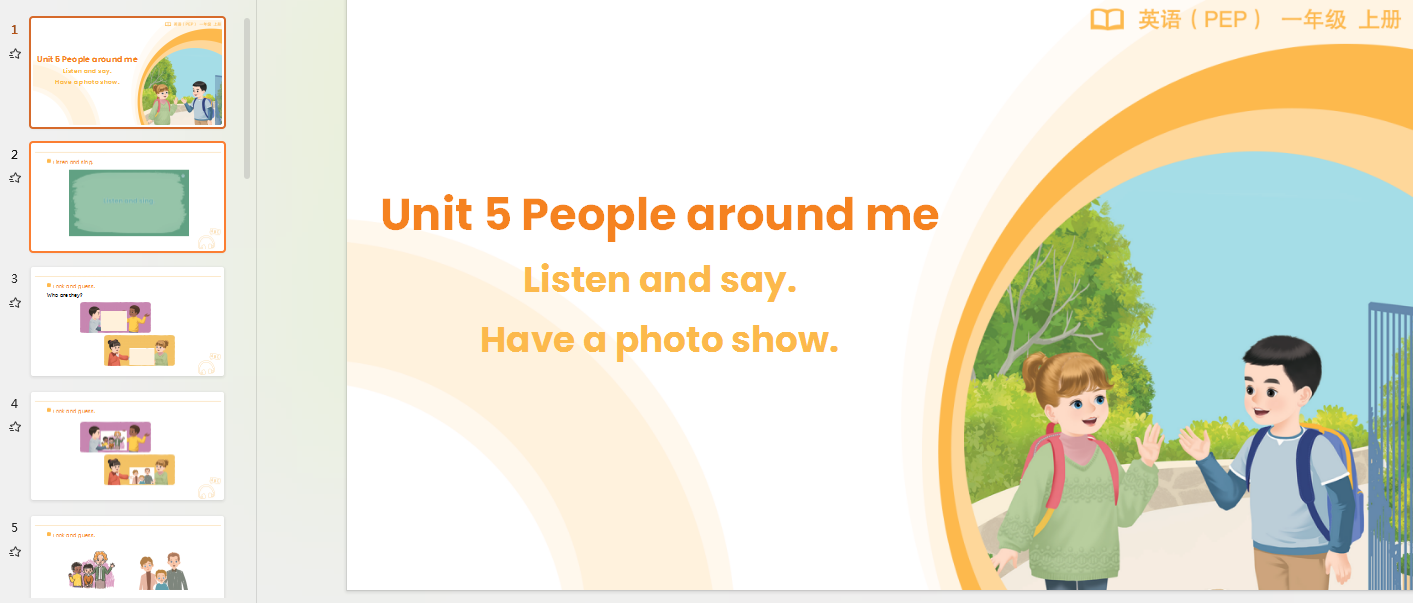 本文标题:人教PEP英语2024年一年级上册PPT课件:Unit 5 People around me (Listen and say. Have a photo show.)_original.pptx