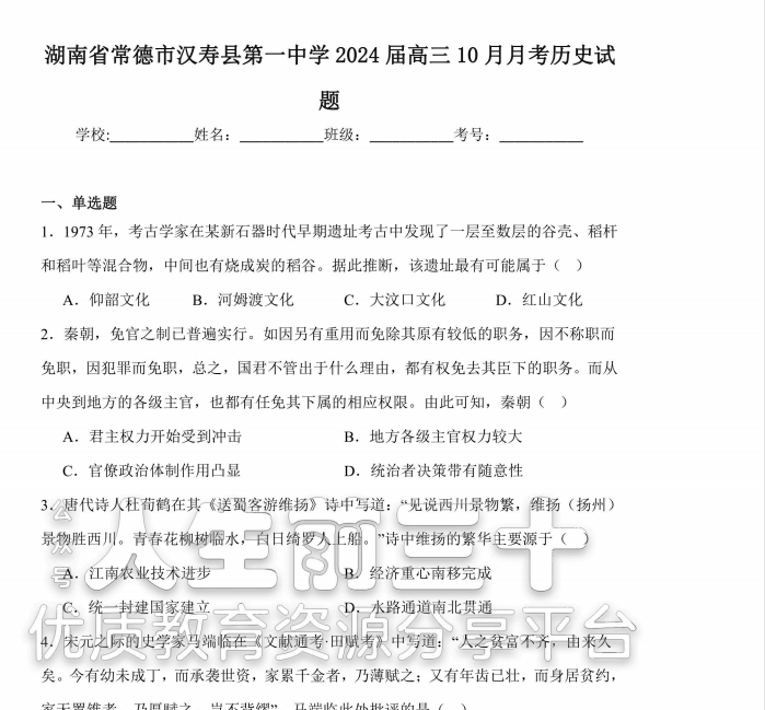 本文标题:4.湖南省常德市汉寿县第一中学2024届高三10月月考历史试题.pdf