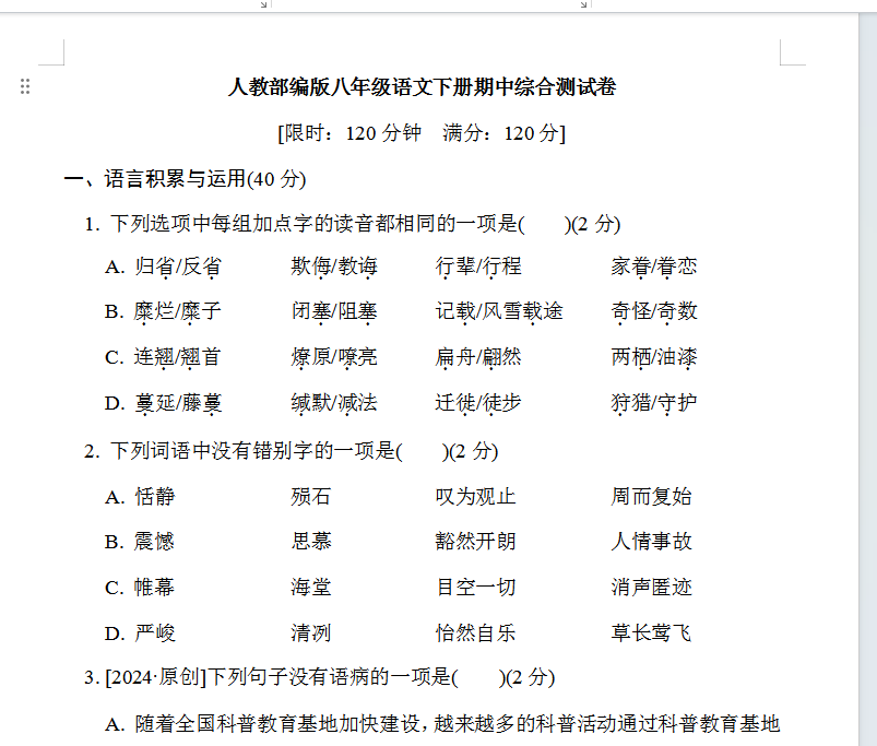 本文标题:人教部编版八年级语文下册期中综合测试卷含答案