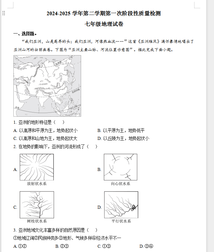 本文标题:2024-2025学年下学期七年级地理第一次阶段性质量检测试卷地理试卷(含答案).zip