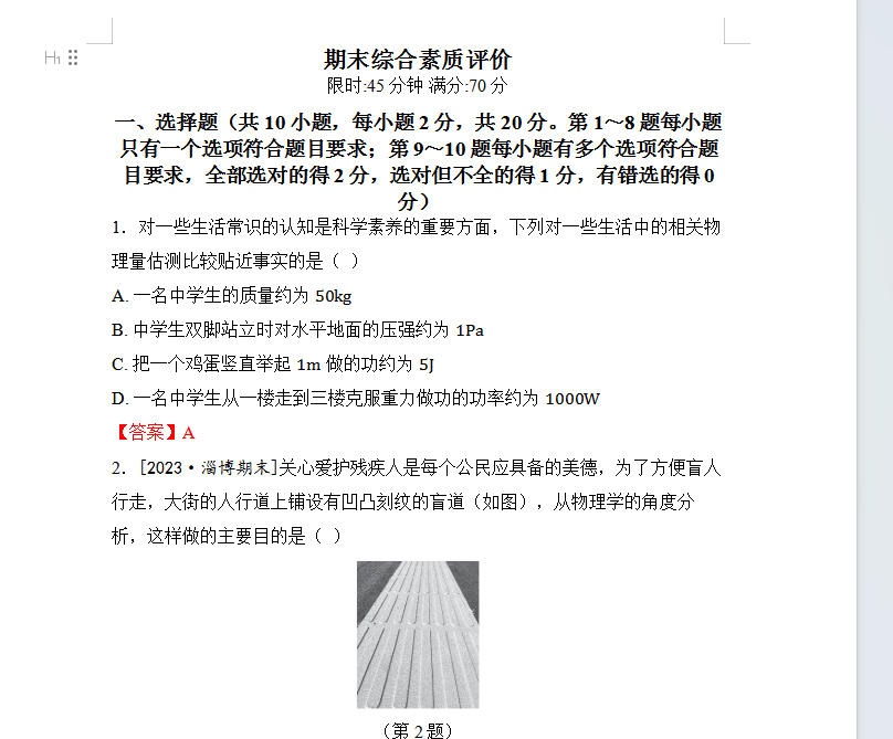 本文标题:北师大物理(25春)八年级下册期末综合素质评价(教用)